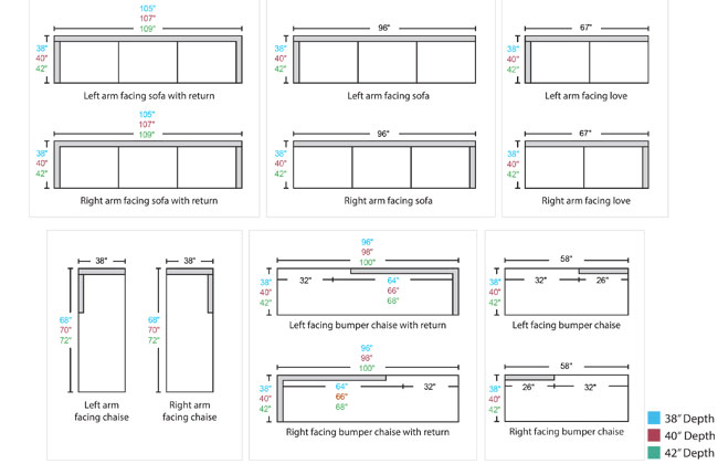 | 1 arm sofa with return | 105/107/109 | 38/40/42 | 36 | 18 |