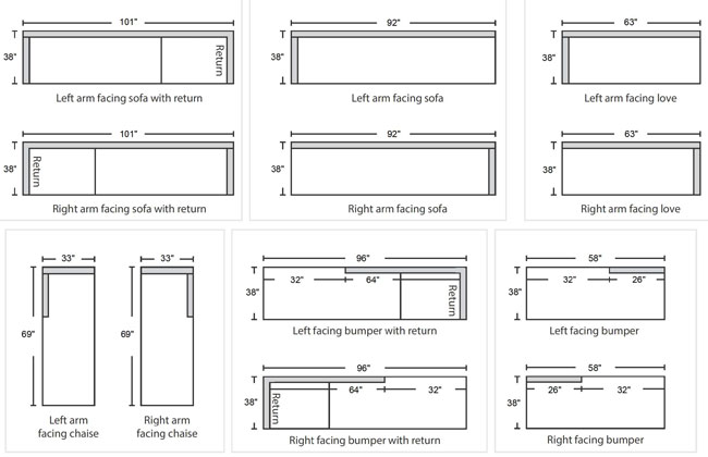 | 1 arm sofa with return | 101/103/105 | 38/40/42 | 32 | 15.5 |