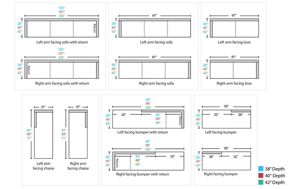 | 1 arm sofa with return | 105/107/109 | 38/40/42 | 31 | 16.5 |